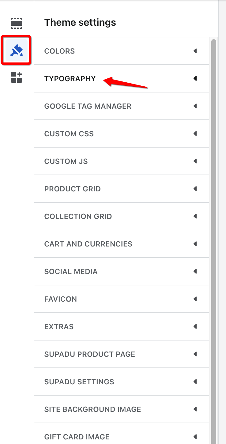 How to change the typography Ella Hartley Updated 26 July 2023 10:17 Share Go to Online Store > Themes In the navigation on the left, click the brush paint icon > Select Typography